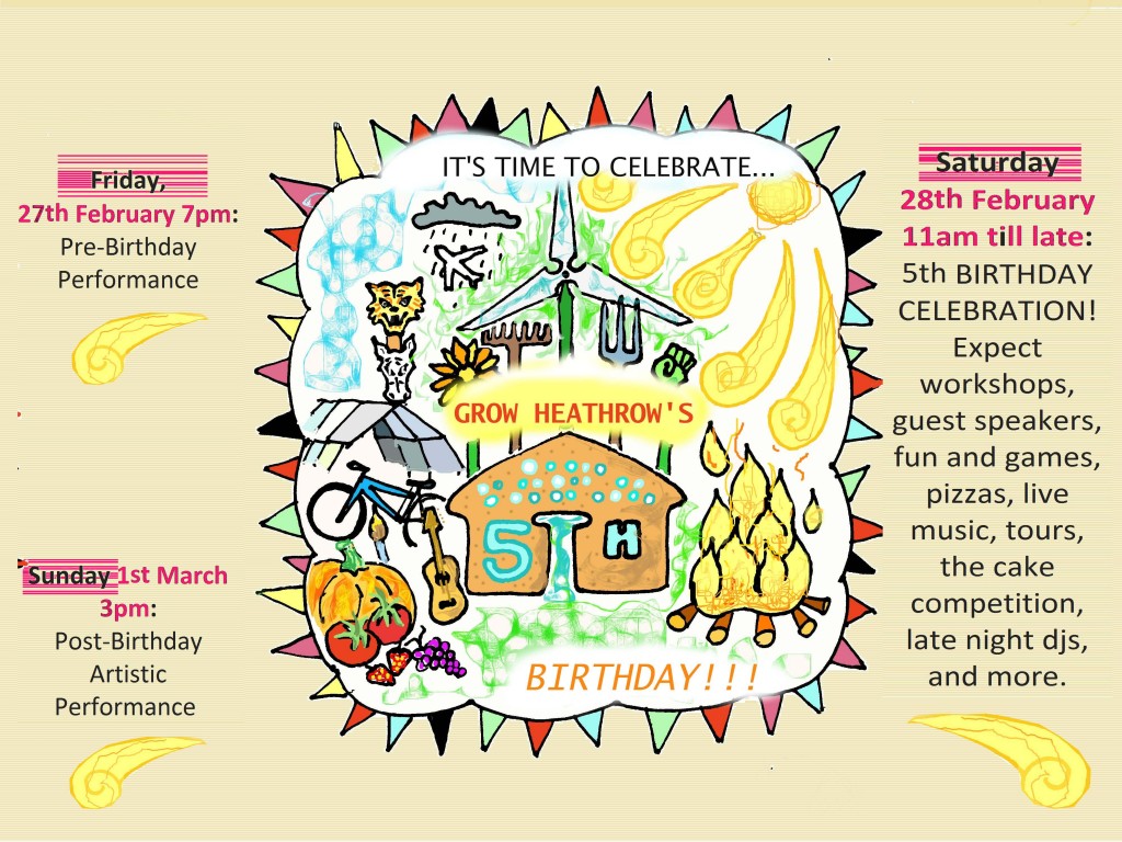 Help us start the next 5 years with a bang by joining in with preparation throughout January and February. We need help fixing, building and painting on site, cooking cakes and spreading the word. Come to the Grow Heathrow site and join in with tasks, especially on a Thursday as that’s our community work day. On the day, we’ll also need help cooking, entertaining the littluns, playing music and more.